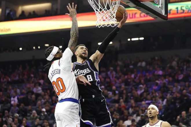 国王带着20分领先优势进入第四节比赛,威少率领国王扩大100-78领先优势,尼克斯一波9-2攻势追到差15分。拉文三分命中,布里奇斯中投追分,阿奴诺比暴扣追到差14分。德罗赞2+1扩大17分优势,麦克布莱德三分追分,阿丘瓦两罚不中。还剩两分半钟国王108-94领先,尼克斯换下主力提前认输,尼克斯继续追分无力回天,最终国王爆冷战胜尼克斯。