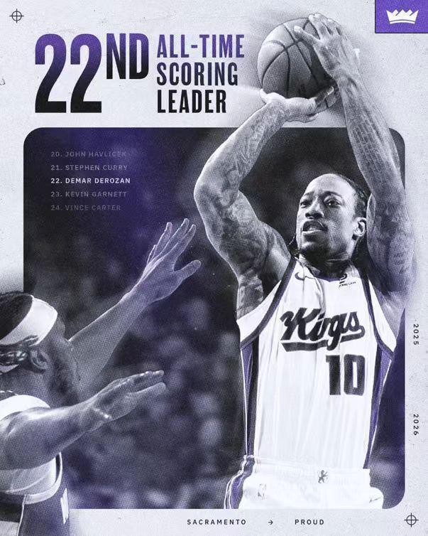 德罗赞NBA生涯常规赛总分超越加内特26071分,升至NBA历史得分榜第22位迎来里程碑。