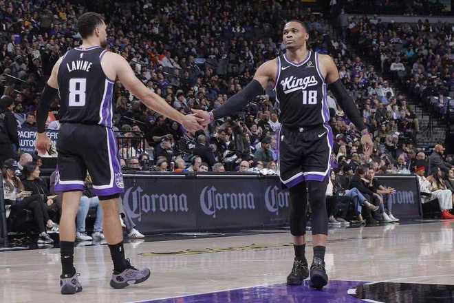 国王:德罗赞27分6篮板5助攻,阿丘瓦20分14篮板,雷诺10分,拉文5记三分25分,威少19分6篮板11助攻。