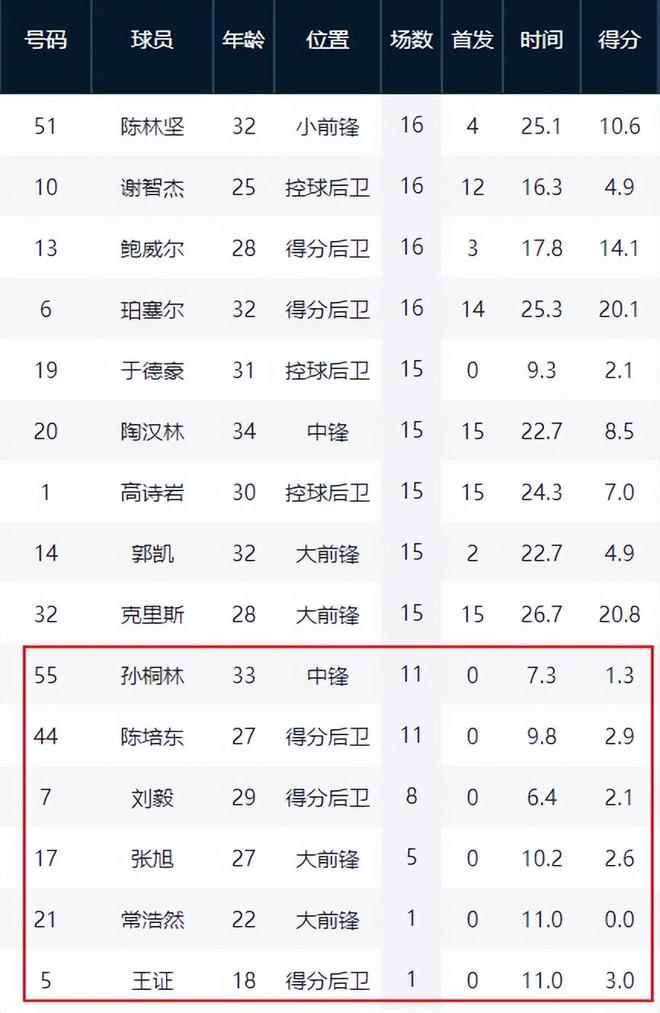 陈培东本赛季上场时间锐减,场均只有9.8分钟,但出场次数达到11次。尤其是从客场对阵北京以后,他的出场机会明显增加,其具有“神经刀”属性的三分球投射,在某些时候还是可以为球队带来帮助的。因此,陈培东被挤出的可能性也不是很大。