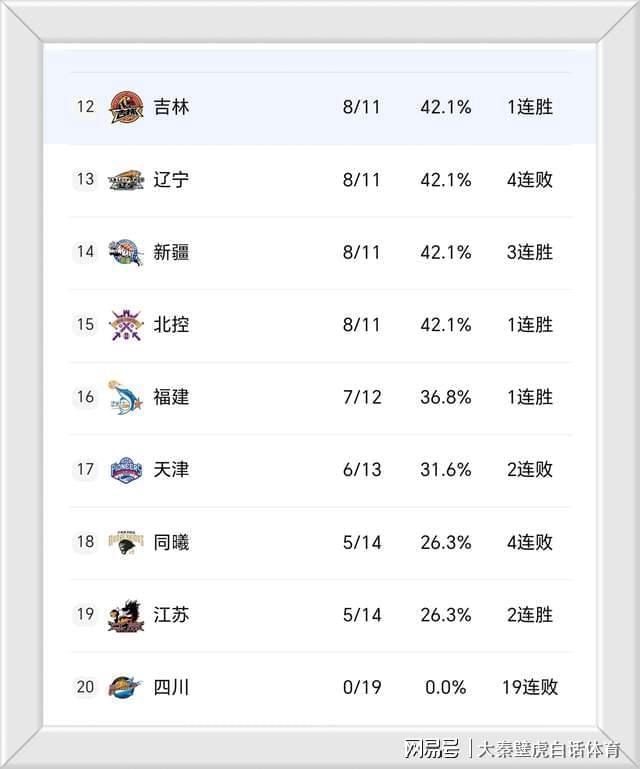 ②、4连败的辽宁男篮排名仅第13位,与第15位的北控战绩相同;