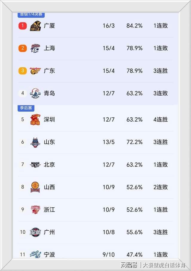 ①、广厦+上海+青岛集体输球,排名仍位居前4,四连胜的深圳队胜场数已经追平青岛;