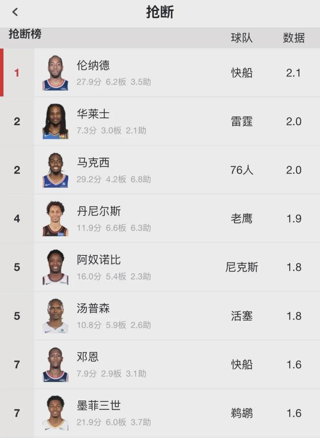 小卡出战场数跟文班持平,比约基奇多1场,这个出勤率不算太差。本赛季伦纳德场均出战33.1分钟,得到27.9分6.2篮板3.5助攻2.1抢断0.6盖帽2.1失误,三项命中率:49.8%,39.7%,94%。场均得分联盟第8,场均抢断联盟第1。