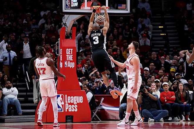 本场比赛中,马刺的替补侧翼大将凯尔登-约翰逊(Keldon Johnson)又一次打出了非常出色的表现。约翰逊全场出场26分40秒,投篮15中8,三分线外4中1,得到了17分7篮板5助攻的全面数据,还有1次失误和4次犯规,正负值更是达到了全场最高的+18。约翰逊在进攻端的作用非常突出,他不断通过突破完成得分,他的冲击力和篮下终结能力都是值得肯定的,而且他也具备一定的外线投篮威胁。除此之外,他也展现出了不错的传球能力和组织能力,他在这方面的表现同样是超出预期的。约翰逊在比赛第三节单节拿下了9分,这也为球队追回比分以及在比赛第四节奠定胜局做出了不小的贡献。约翰逊算是又一次很好地扮演了超级第六人的角色,成为了球队取得胜利的关键人物。