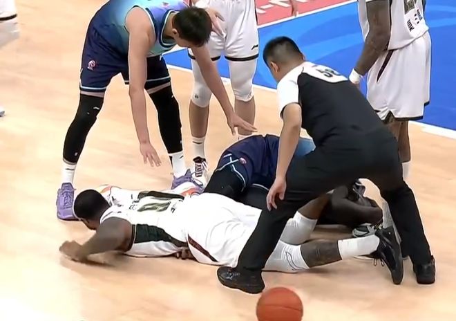 第二节亨特与法尔抢地板球,法尔的头部与亨特的膝盖相撞。