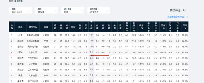 截至联赛第21轮,周琦场均可拿到3.6个前场篮板,9.1个篮板,完成1.5次封盖。他的这三项数据,分别力压众多外援排在各项榜单榜首以及第四位,第七位,可见他的护框能力非常出色。
