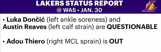 北京时间1月30日,湖人官方更新了明日对阵奇才的伤情。奥斯汀-里夫斯因小腿拉伤缺席了此前的17场比赛,目前状态已升级为出战成疑(上场可能50%),东契奇因左脚踝酸痛也被列为出战成疑。此外,新秀蒂耶罗继续伤停。