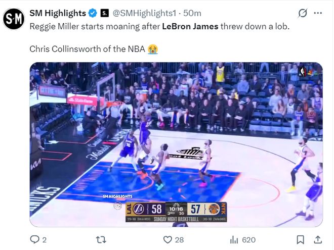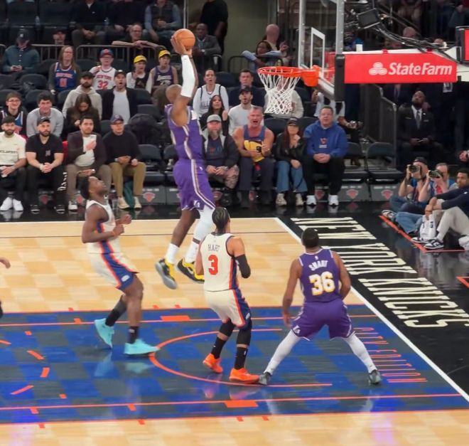 这场比赛41岁的勒布朗-詹姆斯又成为麦迪逊广场花园最闪耀的那颗星,他在上半场就完成了一次空接暴扣,这一球斯玛特传给他恰到好处,詹姆斯高高跃起完成了平筐空接。