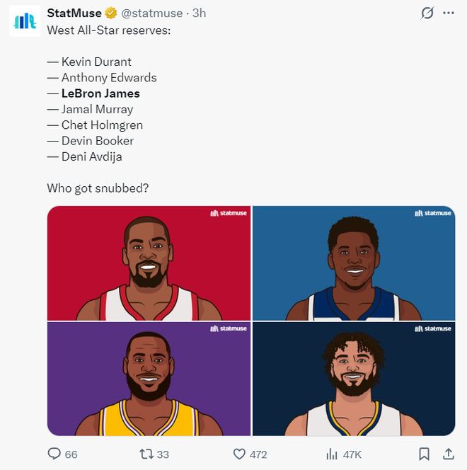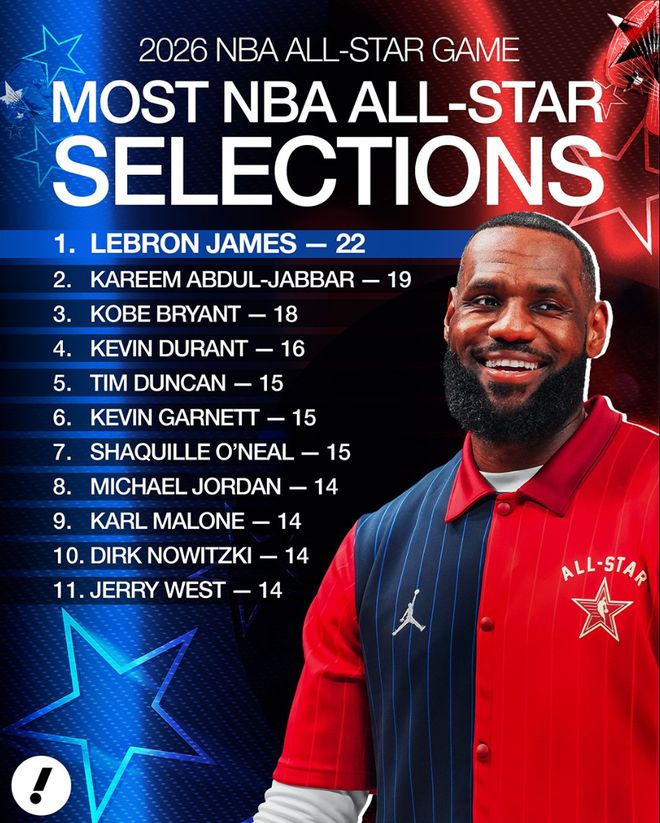这场比赛之前,NBA官方宣布了西部全明星替补:杜兰特、华子、詹姆斯、穆雷、霍姆格伦、布克、阿夫迪亚。换言之勒布朗-詹姆斯连续22年入选全明星。