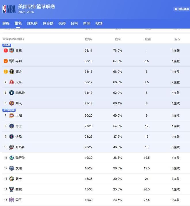 西部纠缠比较激烈的,还有森林狼31胜19负,湖人29胜19负,太阳30胜20负,3队都有拿下第5的机会!