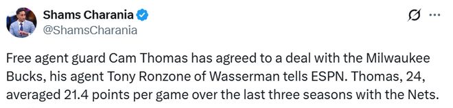 此前,名记Fischer就报道,尽管篮网此前收到过关于托马斯的交易报价,但雄鹿是唯一一支真正对他有实质兴趣的球队。如今托马斯成为自由球员,雄鹿签下也是顺理成章。