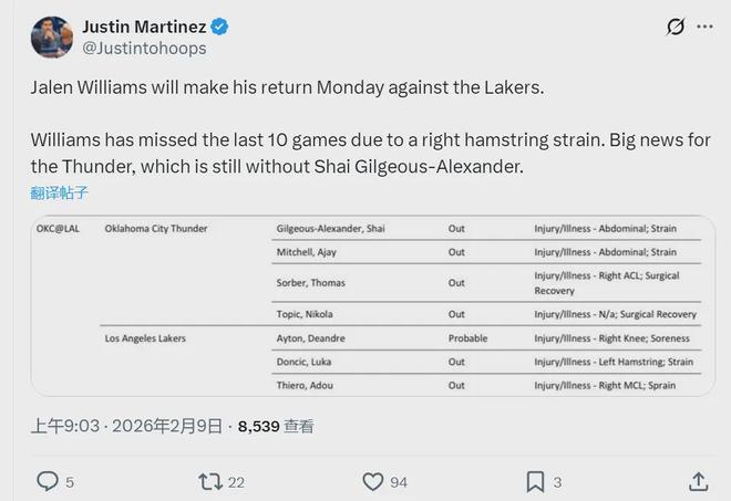北京时间2月9日,雷霆官方宣布:亚历山大(腹部拉伤)、阿杰伊-米切尔(腹部拉伤)索伯(右膝十字韧带撕裂)、托皮奇(睾丸手术),将缺席明天和湖人的比赛。此外,已经连续缺席10场比赛的杰伦-威廉姆斯,将在明天复出!