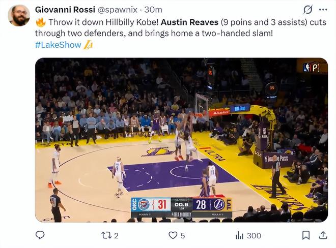 詹黑媒体:哎呀,里夫斯只是在试图碰瓷,他简直是用身体去撞击对方。我只针对里夫斯,我们明白了,你们都讨厌湖人队。