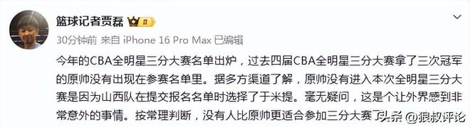 打听了一下,听说是山西队主动报名于米提顶替了他,于米提本赛季投的确实不错,但联赛中的三分命中率和场均贡献数据还没有赶上原帅,这样一来,等于是“剥夺了”原帅创造全明星历史的机会,这个操作,确实很诡异。