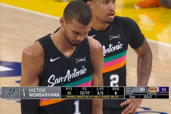 这场球一开场,文班亚马就给比赛奠定了基调,他里突外投,造犯规,补篮,扣篮,什么都有,湖人根本没法防守。首节打了8分钟,8投7中,狂砍25分,太恐怖了。单节25分,是他个人单节纪录。第二节比赛,文班亚马中段才登场,但他登场后,并没有首节那种攻击欲望,但是他强大的强制力,以及全方位的火力覆盖,还是让湖人防不胜防,第二节文班亚马砍下12分,上半场就砍下37分!