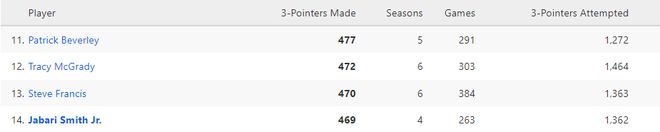 小贾巴里-史密斯三分命中数(470+)超过弗朗西斯升至队史第13位。
