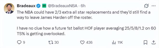 火箭记者Bradeaux写道:就算NBA能再安排2-3名全明星替补,我相信他们依旧会想办法将詹姆斯-哈登排除在全明星阵容之外。