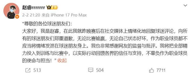 这段争论言论其实早在2月2日赵睿就已经公开道歉,但是并没有帮他逃过处罚,而事情的起因还要追溯到2月1日晚上CBA 常规赛,当时北京首钢在主场87:89惜败青岛队,作为中国男篮队长赵睿在关键时刻的两罚不中,赛后部分球迷对于赵睿的表现很不满意,认为他葬送了球队扳平的机会。