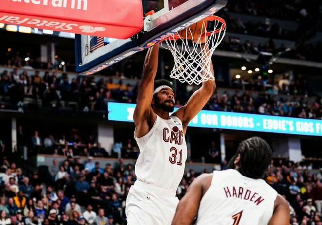哈登的加盟让骑士的后场组合变得极具兼容性。米切尔作为持球爆破手,能撕裂防线制造空间;哈登则以组织和投射为核心,擅长利用挡拆和传球撕开对手防线。两人一攻一传、一突一投,互补性极强。更重要的是,这套组合直接激活内线的阿伦。阿伦本赛季出战34分钟,16投10中,罚球4中2,高效砍下22分13篮板1助攻的数据。在莫布里缺阵的单塔阵容下,阿伦面对约基奇的防守压力丝毫不落下风。他不仅在护框端限制了掘金的内线冲击,还在进攻端多次顺下接球终结。
