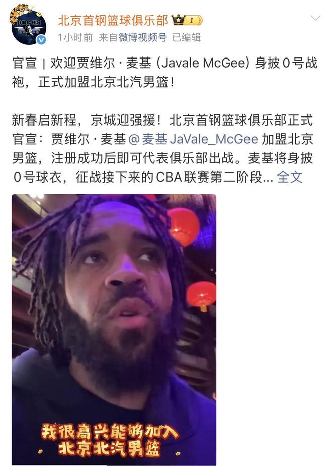 这位拥有NBA冠军基因的内线,已经迫不及待,麦基难掩兴奋,他表示很荣幸加入北京北汽男篮,期待与队友并肩作战,用激情与实力回馈京城球迷,还特意通过视频的方式为大家送上新春祝福!