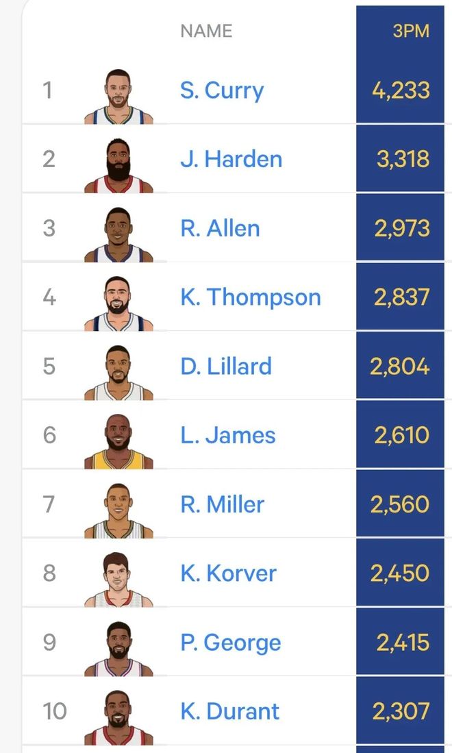 目前的NBA历史三分榜上,现役球员占了7位,其中前四分别就是库里、哈登、汤普森、利拉德。