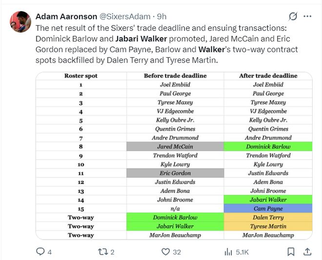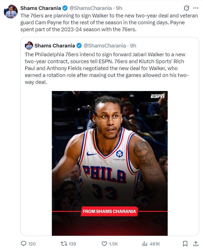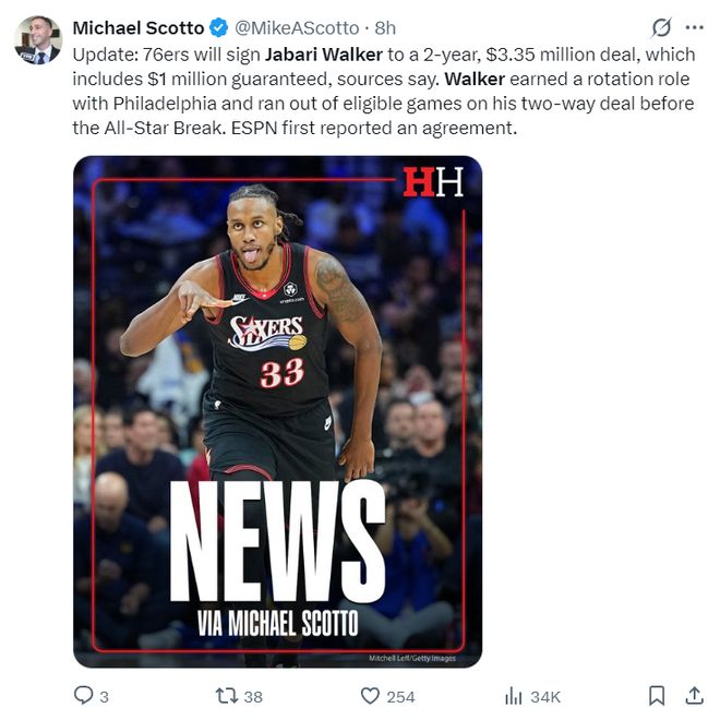 根据迈克尔-斯科特的报道,费城76人与贾巴里-沃克签下的是一份两年335万的合同,而这两年合同仅保障100万美元。费城在全明星周末前就已经为沃克预留了轮换位置,当他双向合同日期截止后立马为其办理了转正。