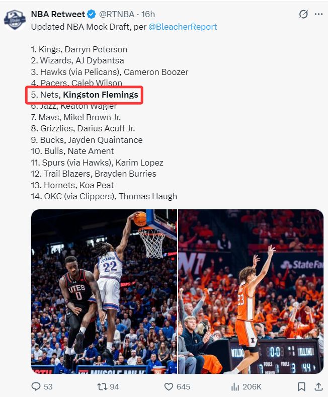根据美媒《露天看台》的选秀预测,弗莱明斯的确是第五顺位,而他们则预测篮网抽中第五顺位,篮网选中这位身高1.93米的顶级控球后卫。