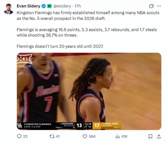 根据埃文-斯迪瑞的报道,金斯顿-弗莱明斯已经在众多NBA球探心目中稳居2026年选秀大会前五热门。他本赛季场均16.6分5.3助攻3.7篮板1.7抢断,三分命中率38.7%,他要在2027年才年满20岁。