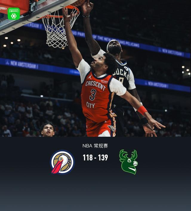 北京时间2月21日NBA 常规赛,新奥尔良鹈鹕对阵密尔沃基雄鹿。半场鹈鹕65-71雄鹿,最终鹈鹕118-139雄鹿。