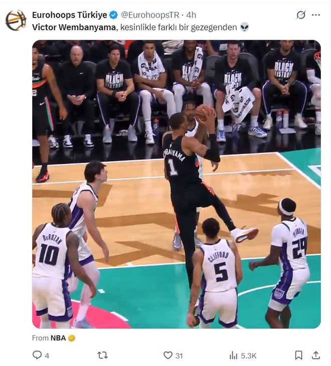 此役文班亚马海在主场完成了一次持球突破的拉杆抡臂暴扣,裸足2.24米的文班亚马还能完成如此炸裂的动作让不少球迷觉得比全明星扣篮大赛还要有趣。