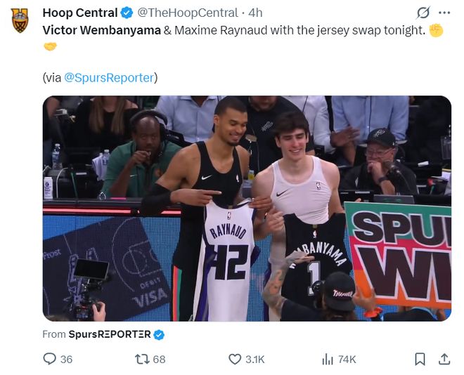 赛后文班亚马与自己法国国青队友雷诺互换了球衣。此役文班亚马29分45秒,20中11,三分5中1,罚球7中5拿到28分15篮板6助攻1抢断4盖帽,命中率55%。雷诺则拿到16分12篮板1盖帽。此役后文班亚马生涯第545次盖帽已经升至马刺队史第五。
