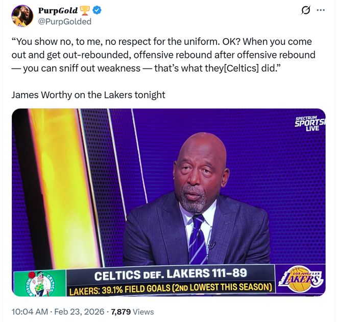 作为解说嘉宾的湖人名宿沃西更是一针见血的指出:“你们没有表现出对紫金军团球衣的尊重,一次又一次被对手抢下前场篮板,这让他们嗅到了你们的弱点。”