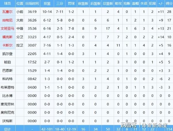 在备受瞩目的顶级对决中,马刺队于客场以114-103的比分力克东部领头羊活塞队,豪取九连胜佳绩,同时终结连胜势头。以下是两队关键球员的数据表现: