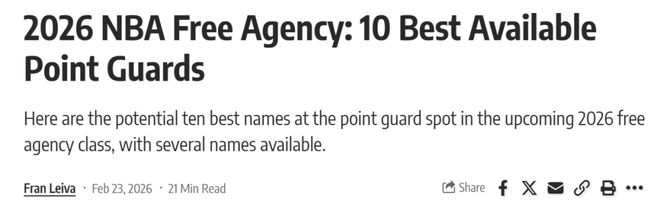 在常规赛进入后半段冲刺之际,美媒《FW》提前评选出26年休赛期自由市场10大控卫名单,其中火箭队范乔丹屈居第5,哈登意外落选。