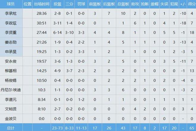 韩国男篮数据如下: