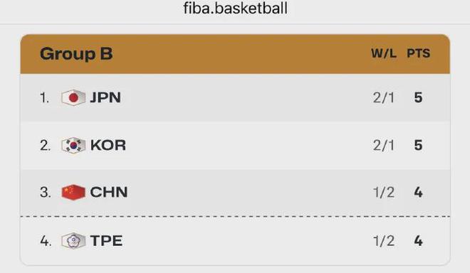 根据最新排名,尽管中国男篮和中国台北队都是1胜2负,可凭借净胜分优势位列B组第三。