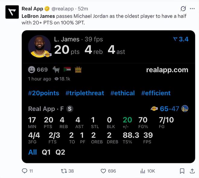 此役詹姆斯创造多项纪录:1.超越乔丹成为上半场三分命中率100%且拿20+最年长的球员;