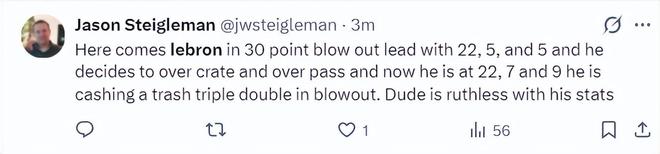 这场比赛美记Jason Steigleman写道:勒布朗在湖人领先30分时还登场,当时他的数据是22+5+5,他还是决定登场刷数据,他希望在一场大比分领先的情况下刷三双,这家伙真是对数据非常痴迷。