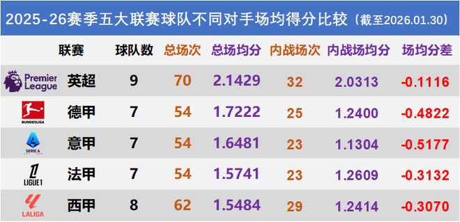 这也侧面证明了“五大联赛”果然不是白叫的,因为各大联赛的场均得分都出现了不同程度的下滑,说明比起其他中小联赛的对手,五大联赛球队还是不太好踢的。