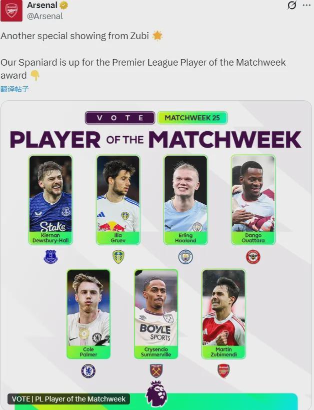 祖比门迪入选了上周英超最佳球员候选。