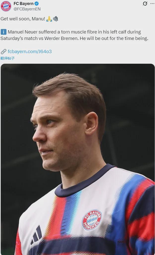 官方:拜仁宣布诺伊尔在周六对不莱梅的比赛中左小腿肌肉纤维撕裂,他将缺阵一段时间。