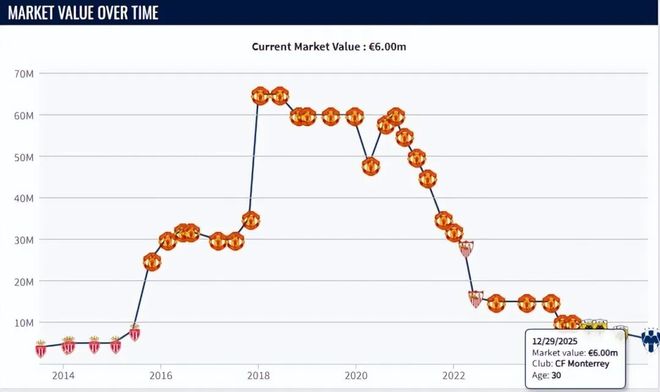 其中2015年6000万买入的马夏尔,堪称是“古早版”失败者。自摩纳哥出道后他来到曼联的,起初表现还算稳定,到2018年前后身价到过6500万的高度的。可遗憾的是之后他再无太好的机会,2020年前后则遭遇到了崩盘,身价一落千丈的。到2022年只有3000万不到。