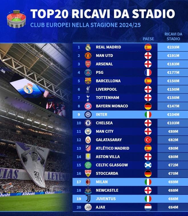 上赛季欧洲俱乐部门票收入:皇马2.33亿第1,曼联阿森纳二三位