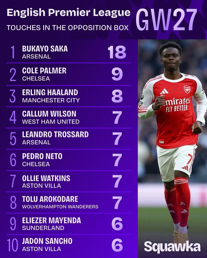 英超第27轮战罢,阿森纳客场4-1大胜死敌热刺。据知名数据机构Squawka统计,本场比赛萨卡在对方禁区触球次数高达18次,比热刺全队的这一数据加起来还多11次,也是本轮英超其他球员的两倍以上。